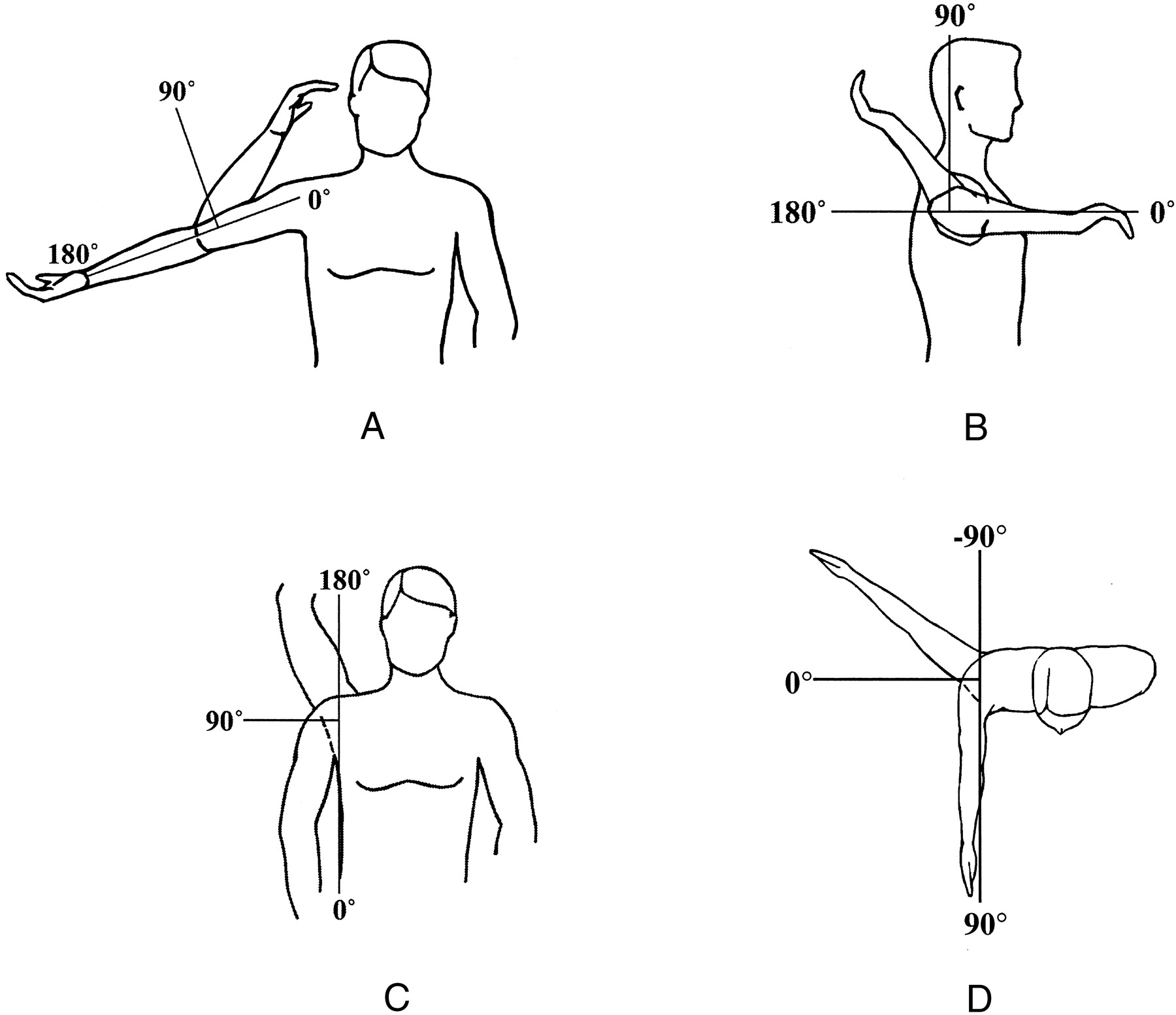 Shoulder abduction: how far the shoulder is away from the body which were both between 96 & 98 degrees angle from the body. If you place your elbow perfectly at shoulder height you will have 90 degrees of shoulder abduction. Bottom Left (C).