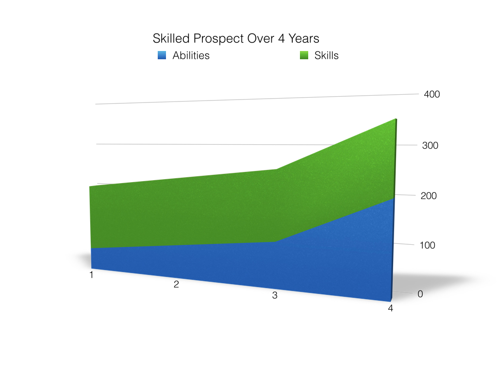 To illustrate this point I’ve created this chart to show how a player needs both skill and ability to make it to the major league level, which I have arbitrarily set at the 300 mark.