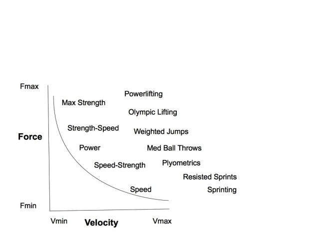 Looking at the chart below we can see some of the exercises that are associated with this part of the force-velocity curve. These types of exercises can help us both measure how much “strength-speed” an athlete has as well as providing a means to train and improve this area if this particular athlete needs to spend time and energy improving this athletic quality.