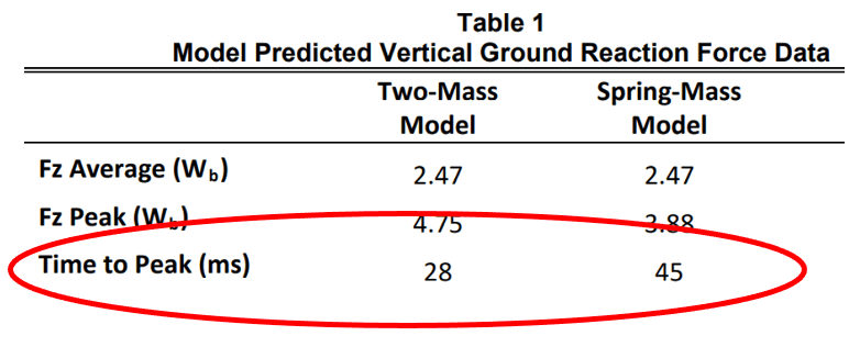 In a study in 2012 by Werner et al (4). they reported that the front leg reached its maximal vertical GRF about 45 milliseconds after the front foot hit the ground. This timeline is similar to what you see in sprinting. Below is a table from a study (3) that used two different models to predict the time it took to reach peak vertical GRF while sprinting. The “spring-mass” model has the exact same time to peak vertical GRF as the pitching study by Werner.