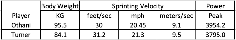 Ohtani is producing a ton of Power. There’s a difference of 159.2 Joules (unit of power) between these two. That difference would be felt if you were standing on top of first base and got run over by each of these elite athletes going all out. Ohtani, carrying 210lbs at 20.45 mph, would hurt that much more than Turner’s 185lbs going slightly faster at 21.3 mph.