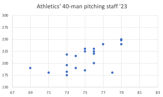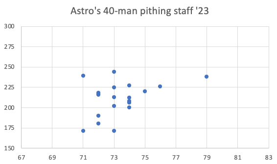 Here are the scatter plots of each team along with their average height and weight for the 40-man roster at the start of this year.