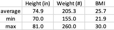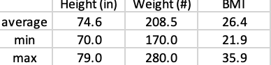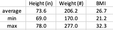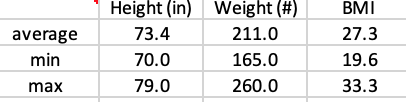 Here are the average, Min, and Max for Height, Weight, and Body Mass Index (BMI)